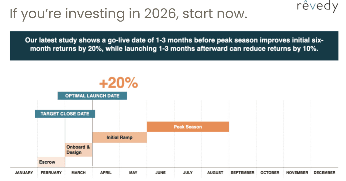 A Revedy study indicates a go-live date of 1-3 months before peak season improves initial six-month returns by 20%, while launching 1-3 months afterward can reduce returns by 10%. For this analysis, Revedy considered both the revenue generated during the ramp period and the time afterward when the property is fully operational.